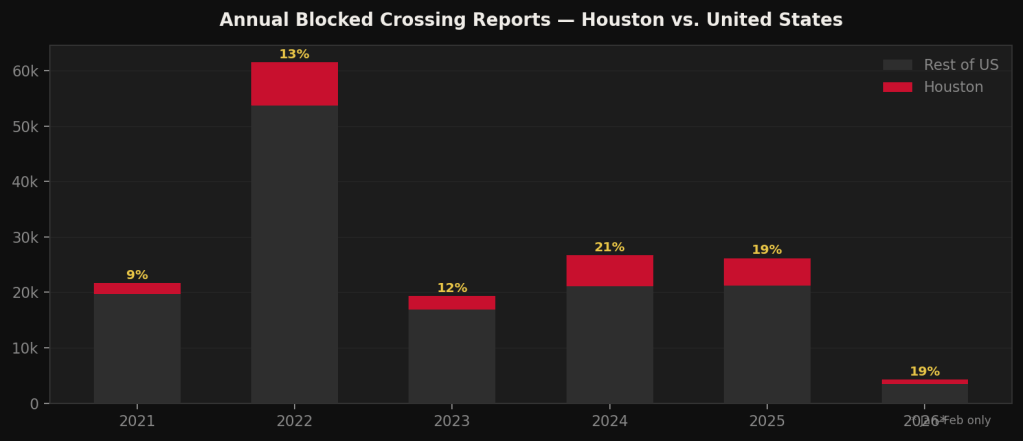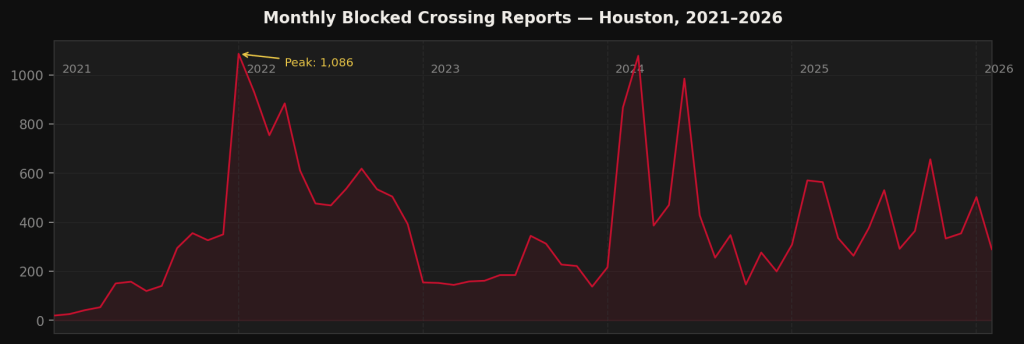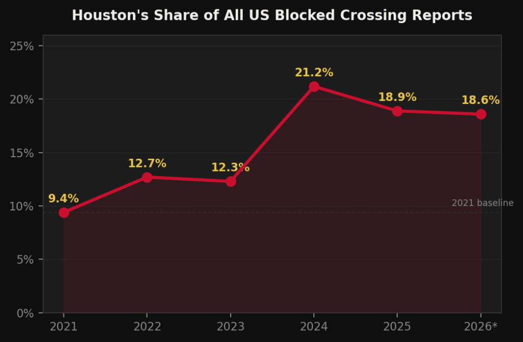 Houston now accounts for nearly 1 in 5 blocked crossing reports filed in the entire United States — up from 1 in 10 in 2021.