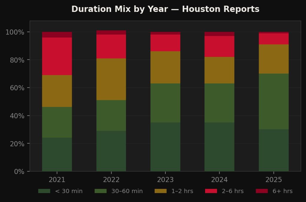 Individual stops are getting shorter — but total incidents have tripled. The neighborhood gets hit more often.