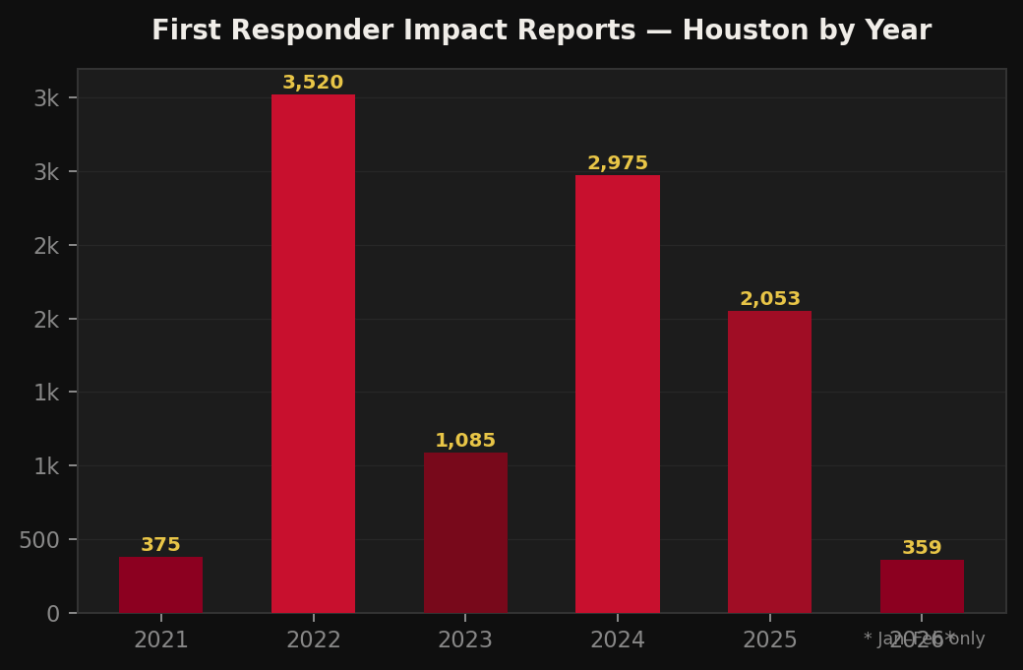 Houston’s share of national reports has nearly doubled, peaking at 21.2% in 2024 and holding above 18% through 2026.